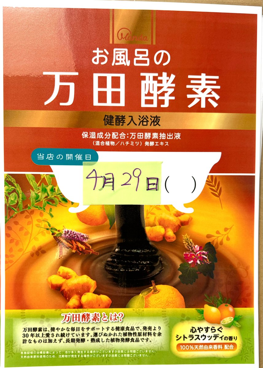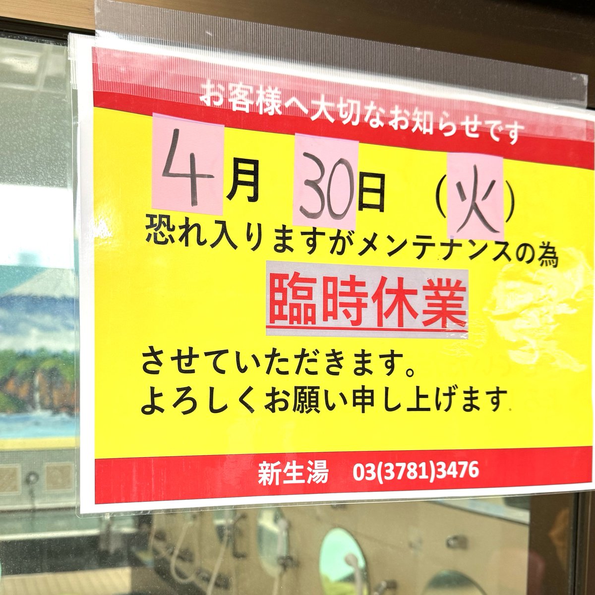 🔴新生湯明日4/30(火)恐縮ですが中休み臨時休業頂きます🙇