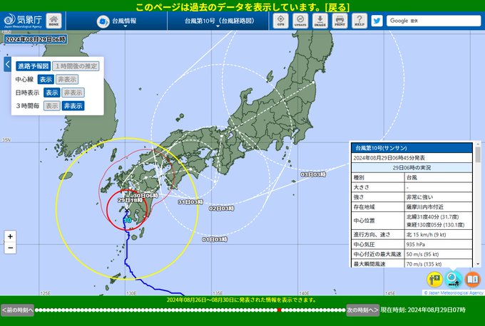【災害時の#気象庁HPを再現】8月26日~9月1日の台風第10号による大雨、暴風及び突風の際、#気象庁ホームページに掲載していた#防災気象情報を再現し、閲覧できるようにしました。当時の#災害対応を振り..