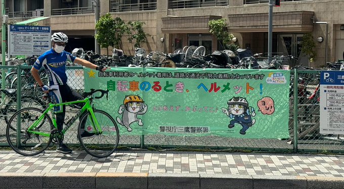 自転車利用者の皆さん、ヘルメットを被って安全&快適なサイクルライフをしませんかあなたの街にも登場警視庁猫第一弾は三鷹警察署管内のココ!分かるかな~?皆さんもヘルメット被って一緒に、ヨシ#警視庁猫#仕事..