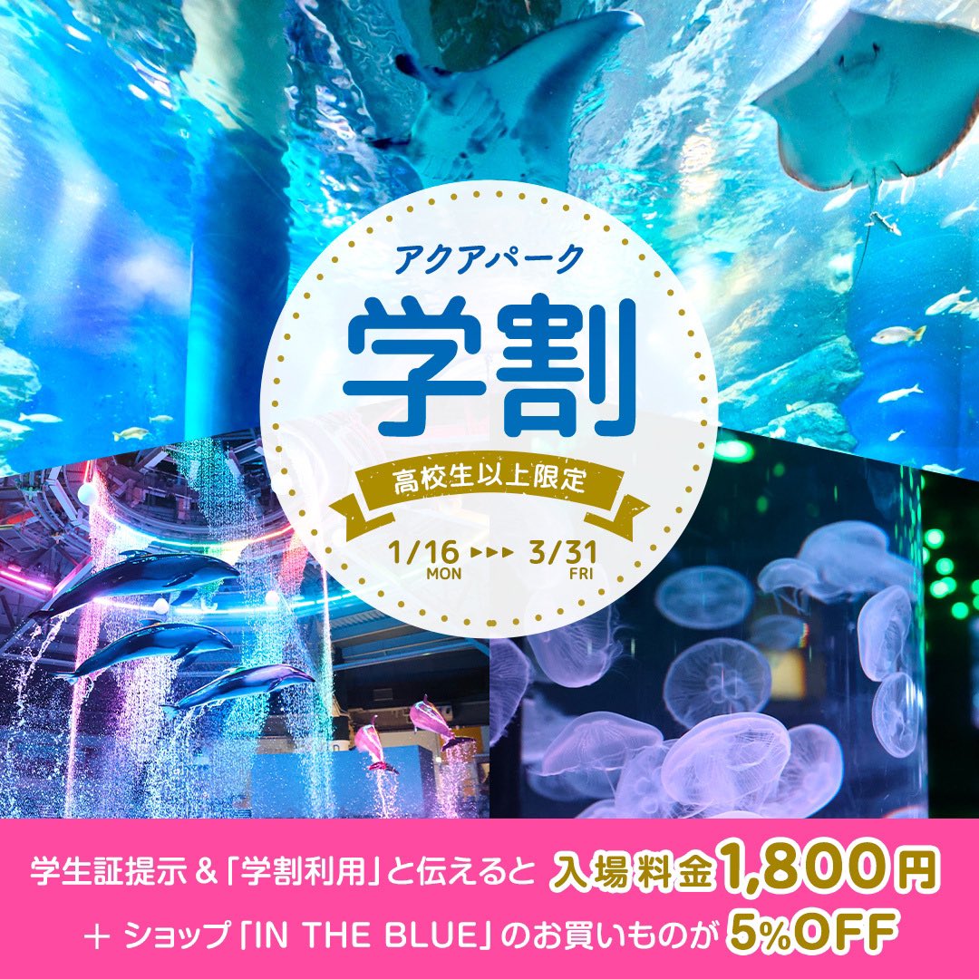 1/16(月)よりスタート!🌸#アクアパーク学割🌸\高校生以上の学生さま限定/チケット窓口で学生証を提示&「学割を利用」と伝えると、入場料金や館内ショップのお買いものがお得に✨▼詳細はこ..