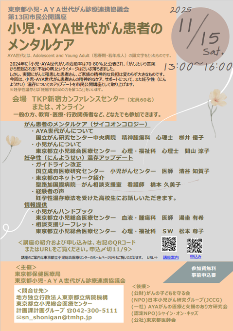 「小児・AYA世代がん患者のメンタルケア」をメインテーマとし、市民公開講座を開催いたします。サブテーマの「妊よう性温存アップデート」では、妊よう性温存を経験された高校生の方からのご講演もございます。ぜひご参加ください。https://tmhp.jp/shouni/info/lecture/public/event2025/shiminkoza2025.html…