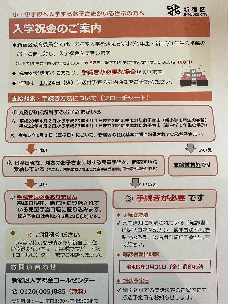 対象の世帯へ令和5年1月24日(火)に案内通知が発送されますが、祝金を受給するにあたり、手続きが必要な場合があります。詳しくは新宿区ホームページへ!