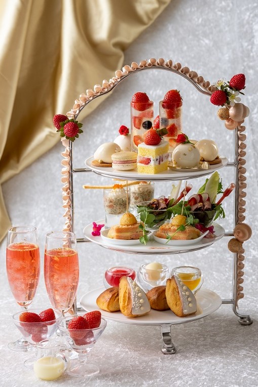 1階ガーデンラウンジでは「苺のアフタヌーンティー“白金の舞踏会”」を開催中。苺づくしのスイーツに加え、軽食としてモンテクリストサンドや”合鴨肉と苺のサラダ仕立て”なども。デートや女子会におすすめです。