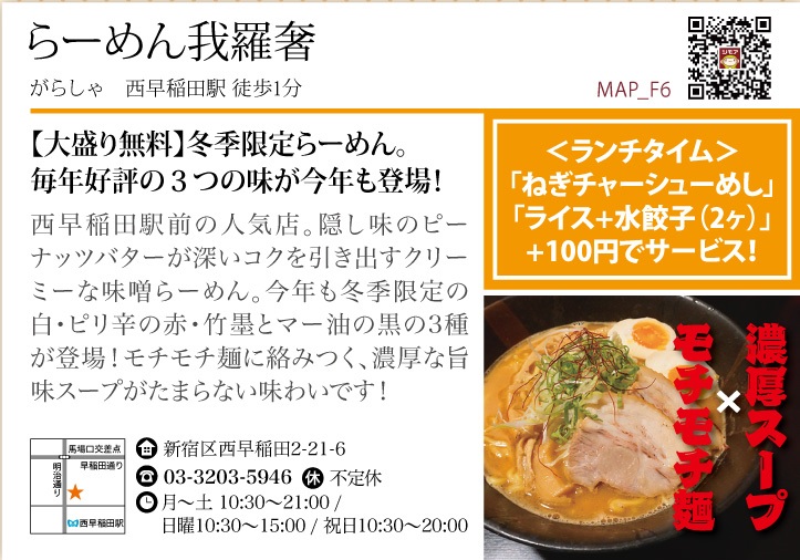 #我羅奢 【ジモア特典:ランチ「ねぎチャーシューめし」or「ライス+水餃子2ヶ」+100円でサービス】 冬恒例の冬季限定らーめんが登場!濃厚スープがたまらないスタンダードな白・ピリ辛の赤・竹墨とマー油の黒の3種。西早稲田駅前の人気店です #らーめん #高田馬場 #ジモア