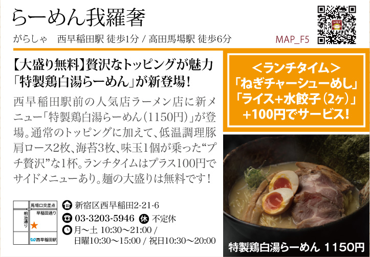 #我羅奢 【ジモア特典:ランチ「ねぎチャーシューめし」or「ライス+水餃子2ヶ」+100円でサービス】 西早稲田駅前の人気店。贅沢なトッピングが魅力の「特製鶏白湯らーめん」が新登場!大盛り無料! #らーめん #高田馬場 #ジモア