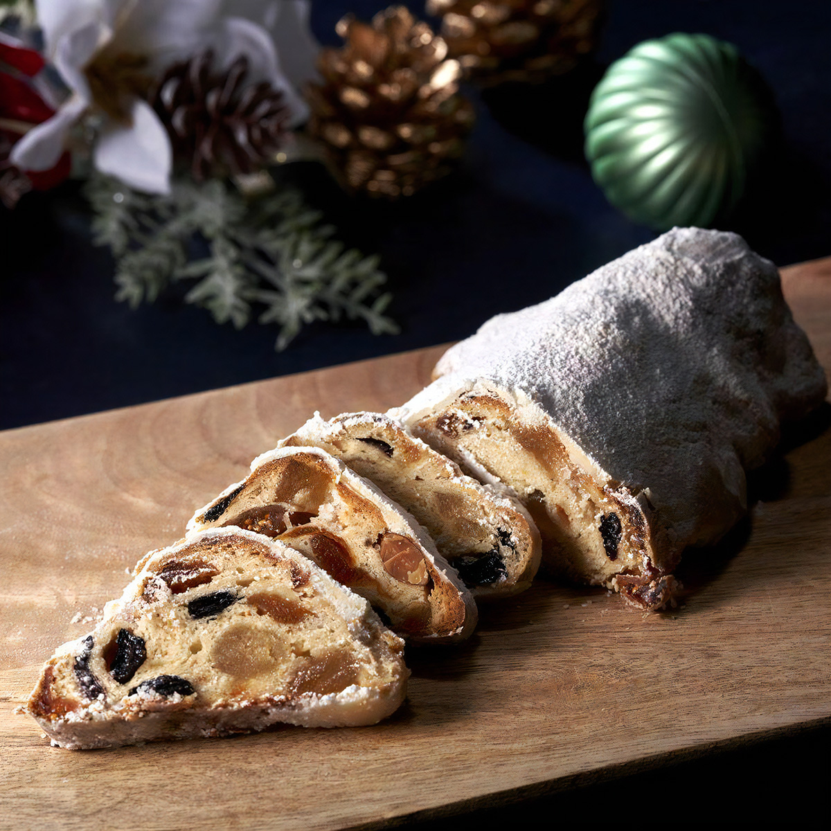 マジパン入りのリッチな生地に、ラム酒漬けのドライフルーツと香ばしいアーモンドを加えて焼き上げたシュトーレン🎄