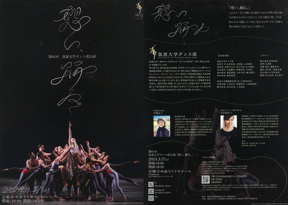 【#外部公演情報】 第61回筑波大学ダンス部公演「想い、踊る。」 日時: 令和6年3月17日(日) 開場18:00 開演18:30 場所:かめありリリオホール 特別振付として #伊藤直子 がダンス部の学生に振付ています❗️ 学生達による『不思議な場所』是非ご期待ください😆 #筑波大学ダンス部 #筑波大学