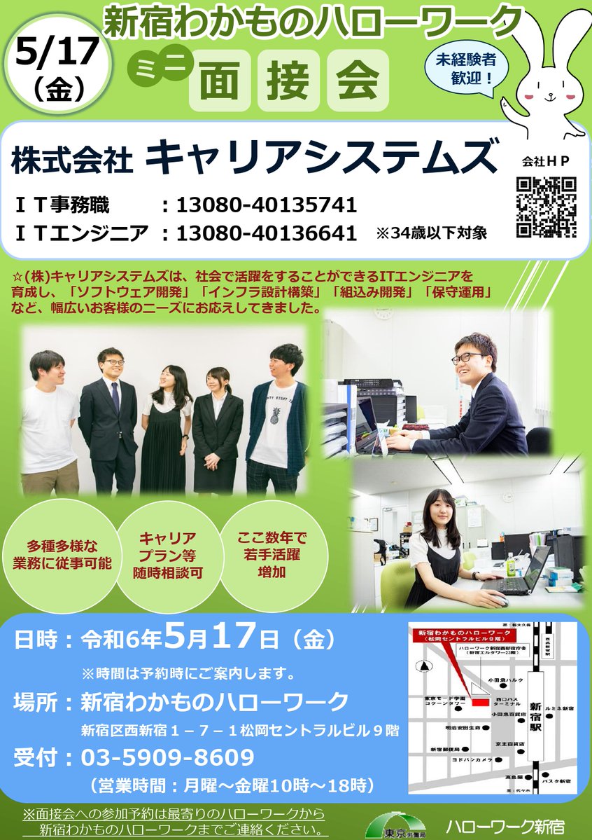 面接会のお知らせ🌸 日時:令和6年5月17日 会社名:株式会社キャリアシステムズ ✅未経験大歓迎 ✅書類選考なしの直接面接 詳細は下記にてご確認ください☺️ #求人 #面接 #IT #IT事務職 #ITエンジニア #事務職 #エンジニア #ハローワーク #企業公式つぶやき部 #就職 #転職