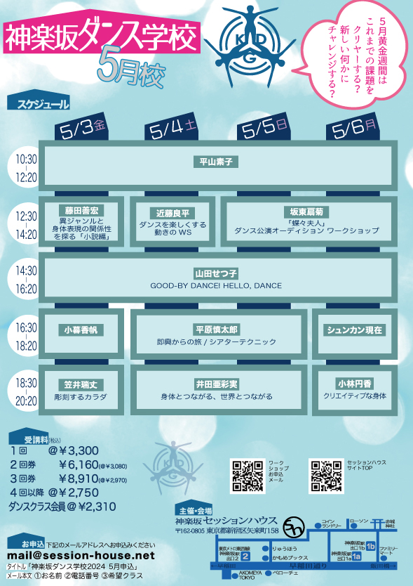 神楽坂ダンス学校2日目、4日は①平山素子、②近藤良平、③山田せつ子、④井田亜彩実、⑤平原慎太郎クラスと続きます。コンテンポラリーダンスのど真ん中で活動する講師たちの直接指導、おススメします!