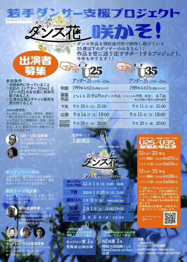 U25,U35のダンサー皆様!この企画の特徴は作品に対しての意見をたくさん聞ける事、話し合えること。観客のアンケート、ダンサーの意見を、専門家が分析、解説します。お互いに熱意を共有する時間が次の作品をうみダンスの密度を底上げします。ダンスがステップアップします!
