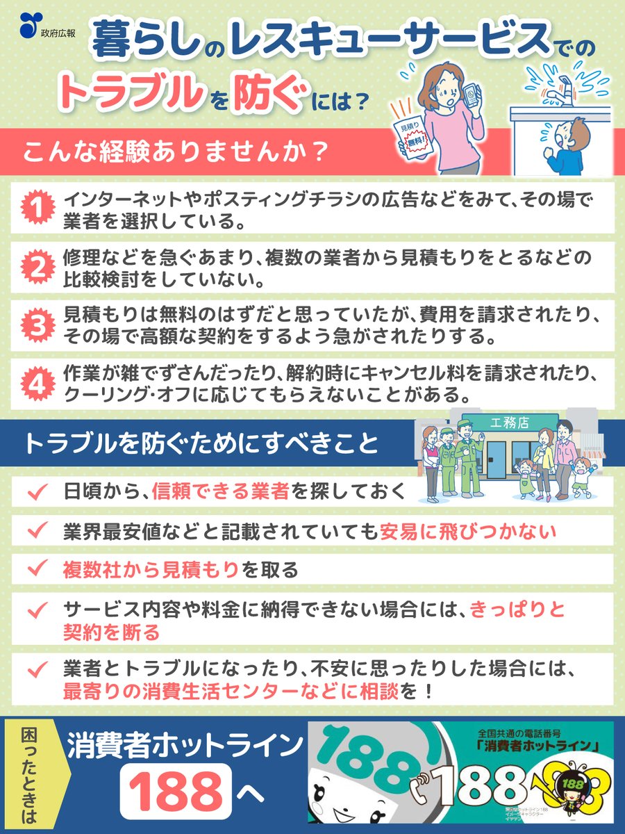 【 #くらしのレスキュー サービスのトラブルに注意しましょう!】 #ジメジメ して 害虫が出てきたので駆除の業者を呼んだり、エアコンの調子が悪いので修理を業者にお願いをするときは、要注意!内容や料金に納得が出来ないときは契約しないこと! おかしいと思ったら、#消費生活センター に相談!