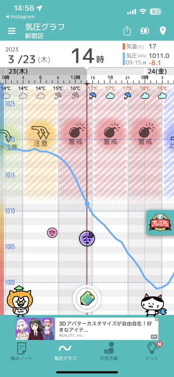 みなさまお疲れ様です 中の人は午後の講座中に急激に 倦怠感、眠気、頭痛がすると思って 利用者様に教えてもらった 頭痛ーるのアプリを開いて見たら、、、 納得 今日はゆっくりお風呂に入って 早く寝ることを堅く誓いました #気圧のせい