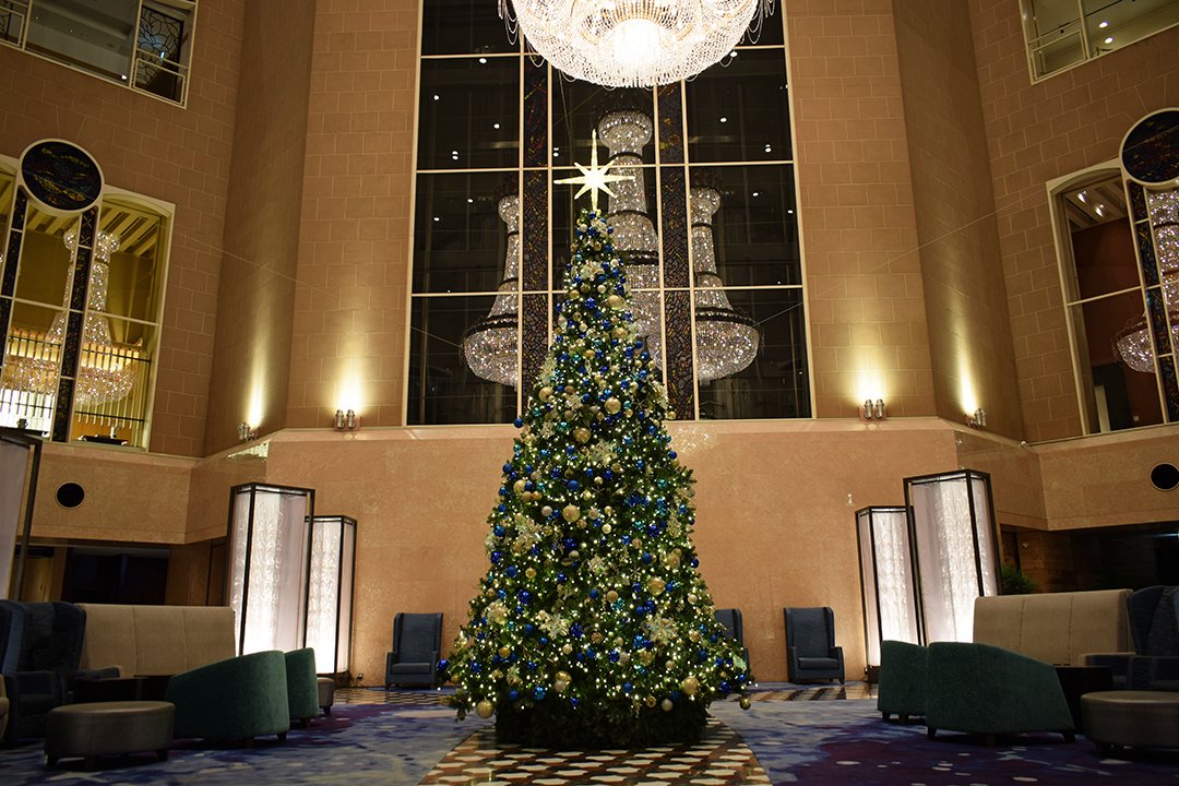 【新宿イルミネーション2022⑪ヒルトン東京】開放感あふれる「マーブルラウンジ」のクリスマスツリー。赤やゴールドのクリスマスオーナメントで飾りつけされたツリーを眺めながら、スイーツビュッフェやお食事が..