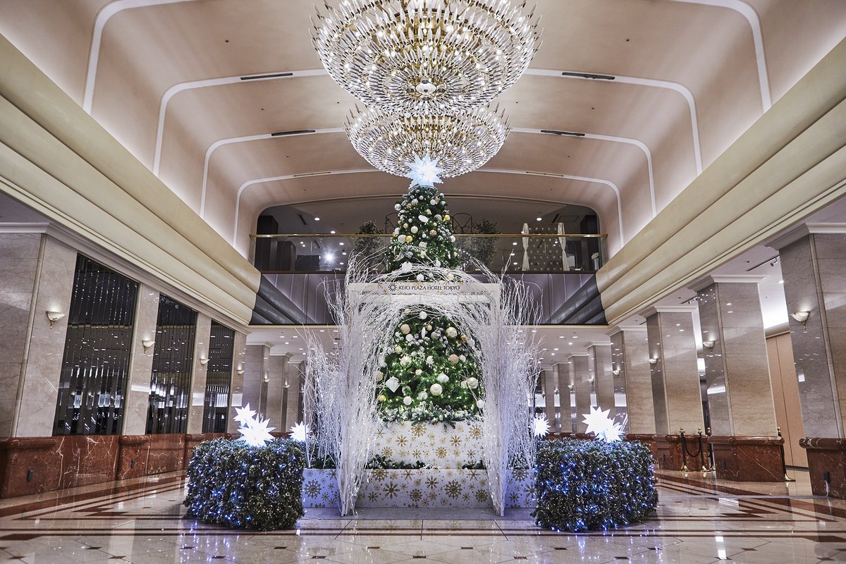 【新宿イルミネーション2022⑩京王プラザホテル】メインロビーの高さ約4mのクリスマスツリー。ホワイトクリスマスを連想させる白が基調の飾りつけにシルバー、ゴールドなどが輝くイルミネーションが煌びやかで..