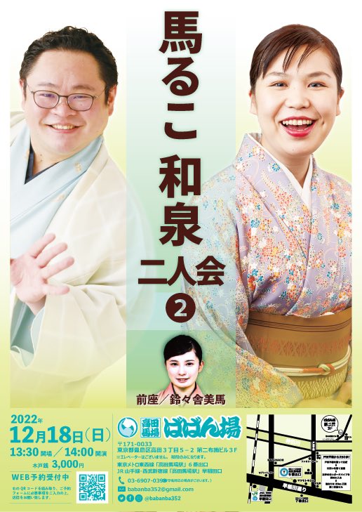 本日の公演です!当日券の席、ご用意できます。12・18(日)馬るこ和泉二人会❷13:30開場/14:00開演木戸銭3,000円[出演]鈴々舎馬るこ弁財亭和泉前座/鈴々舎美馬101