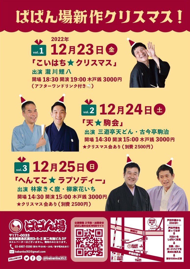 12/25(日)新作クリスマス!vol.3「へんてこラプソディーINクリスマス」14:30開場/15:00開演木戸銭3,000円[出演]林家きく麿柳家花いち★クリスマスパーティー有り(別会費2500円..