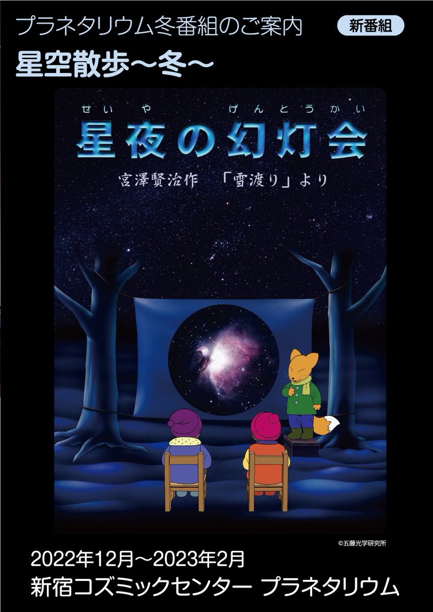 ★星夜の幻灯会~宮沢賢治作「雪渡り」より★#新宿コズミックセンター8階プラネタリウムでは、12/10(土)~2/19(日)まで、冬の星空に纏わるお話と、星のものがたりについてお届けいたします。www...