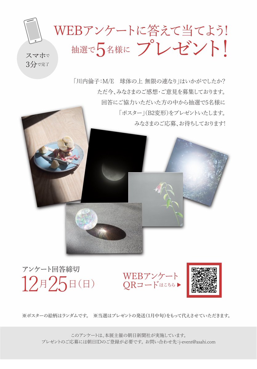 【スマホで3分で完了】 アンケートにお答えいただいた方の中から、抽選で5名様に川内倫子展ポスタープレゼント! 回答締め切り12/25 このアンケートは主催者の朝日新聞社が実施しています。 プレゼントのご応募には朝日IDのご登録が必要です。