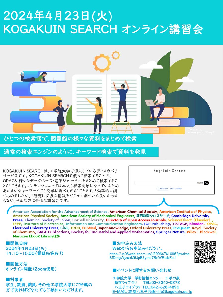 工手の泉ライブラリの様々な資料をまとめて検索できるシステム「KOGAKUIN SEARCH」の講習会を、4/23(火)にオンラインで実施します。効果的に調べものをしたいみなさん、ぜひご参加ください 💁 #kogakuin #工手の泉