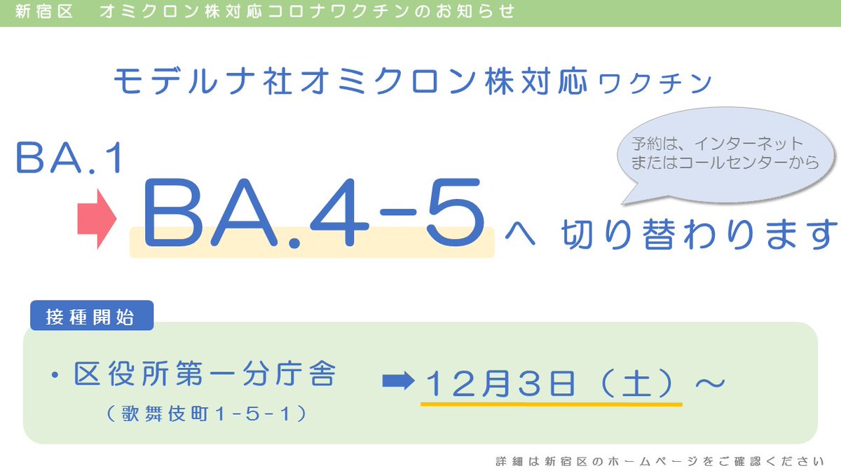【モデルナ社BA.1対応型からBA.4-5対応型へ切り替えます】区役所第1分庁舎で接種を行っているモデルナ社のオミクロン株対応ワクチンについて、12月3日(土)から、BA.4-5対応型に切り替えて接種..