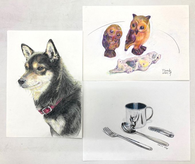 講座作品ご紹介5色で描く色鉛筆画たった5色の色鉛筆で描いたとは思えない、素敵な作品です!#色鉛筆#犬#ふくろう#NHKカルチャー#浜松定時講座のご案内→https://nhk-cul.co.jp/pr..