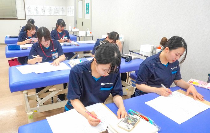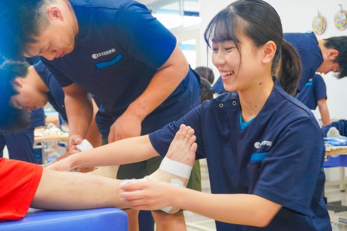 こんにちは!浜松医療学院です柔道整復学科1年生の実技授業を撮影させて頂きました!こちらの授業では、足関節捻挫が起こった場合のテーピングによる固定の実技授業を行っていました!足関節捻挫は、足首を内側に捻..