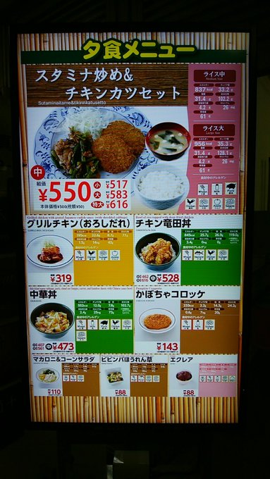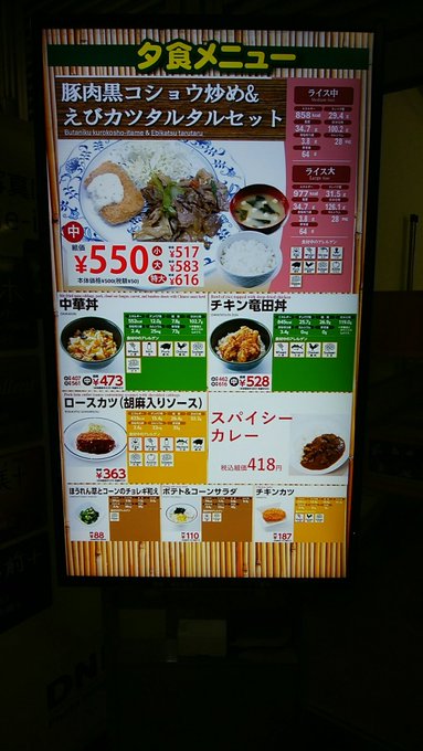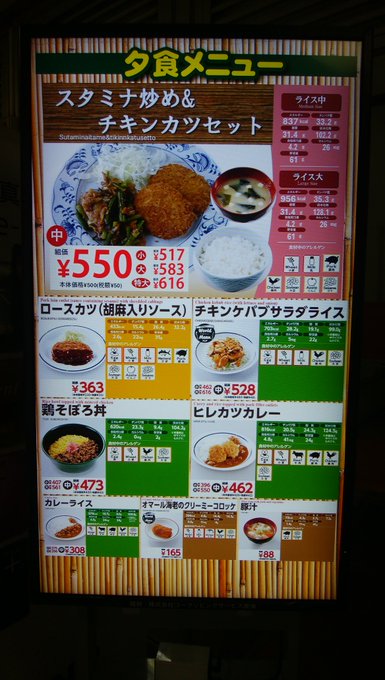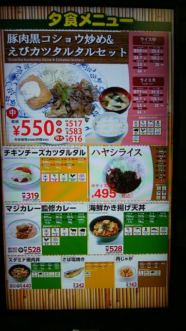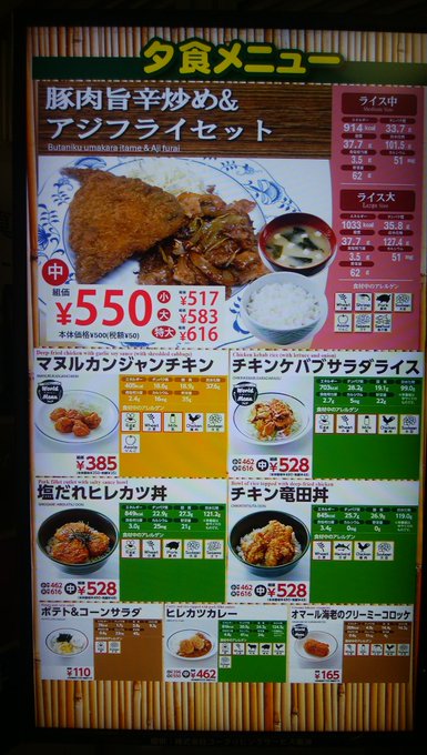 こんばんは! 本日の夕食メニューはこちらになります!本日のおすすめは、チキン竜田丼です! 営業時間は17:00から19:00で、ラストオーダーは18:45です! 皆様のご来店をお待ちしております!