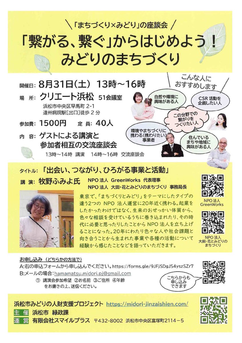 【「みどり×まちづくり」講演会&座談会を開催します!】この分野でのつながりをつくりたい市民や事業者に特におすすめです。開催日:8/31(土)13:00~16:00申込方法や講座内容はこちらhttps:..
