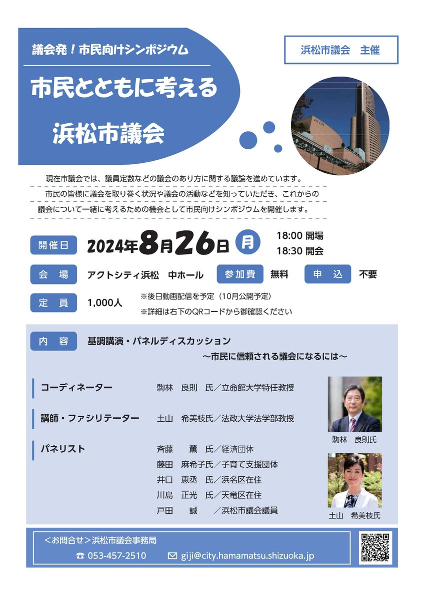 【議会発!市民向けシンポジウム開催】当日は、Webサービス「Slido」を活用して、会場の皆様との対話も予定しています。これからの議会について一緒に考えてみませんか?日時:8/26(月)18:30~場..