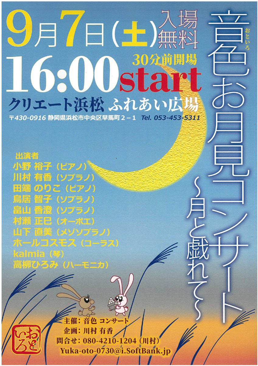 【イベント紹介】ちらしをお持ちいただきました♪「音色お月見コンサート」2024年9月7日(土)16:00~クリエート浜松1階ふれあい広場入場無料です。ピアノ、歌、オーボエ、琴、ハーモニカの演奏です。#..