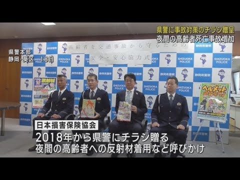 自転車ヘルメットの着用や夜間高齢者に反射材の着用を呼びかけるチラシ9万枚を静岡県警に寄贈 日本損害保険協会