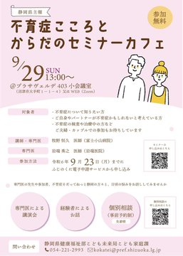 【静岡県主催「不育症こころとからだのセミナーカフェ」】日時:9月29日(日)13:00~参加方法:9月23日(月)までにふじのくに電子申請サービスから申し込み参加無料です。詳しくはチラシをご覧ください..