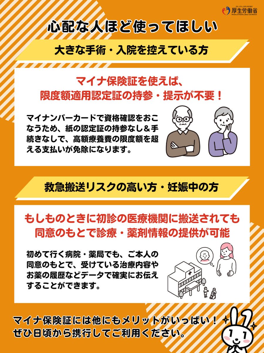 【心配な人ほど使ってほしい】マイナンバーカードの保険証利用には大きなメリットがあります。特に高齢者や妊婦さんなど、下記に当てはまる方はぜひ日頃から携行をお願いします。・大きな手術・入院を控えている方・..