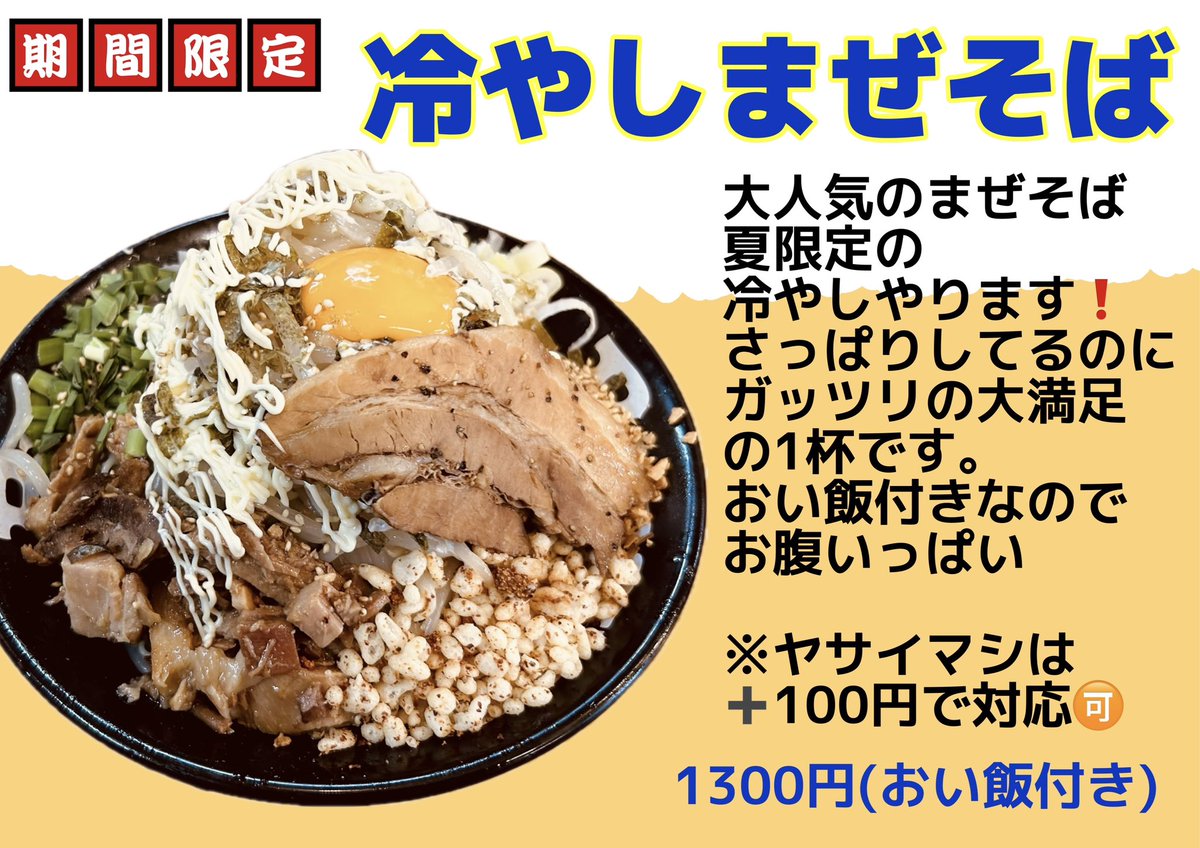 夏の限定、冷やし肉つけ麺は終了いたしました明日8月10日より新しい限定の冷やしまぜそばやりますもやしのナムルや揚げ玉、チャーシューなど凄いボリュームおい飯まで付いてるので お腹いっぱいになります限定のヤサイマシは100円になります。