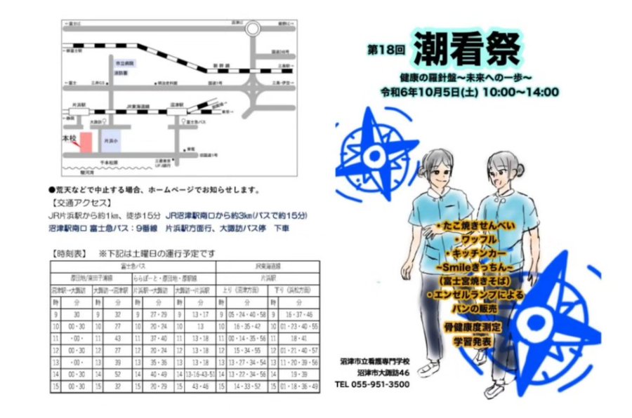 沼津市立看護専門学校の学生祭「潮看祭(しおかんさい)」を開催学生の学習成果と共に、本校の雰囲気を感じて頂ける企画で皆様のご来校をお待ちしています。10月5日㈯10~14時沼津市立看護専門学校(沼津市大..