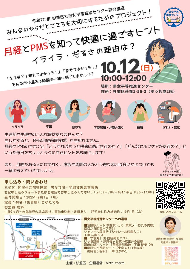 / 講座「#月経 と #PMS を知って 快適に過ごすヒント」 参加者募集中 \ 月経のたびに訪れるあの不快 我慢していませんか? 月経の基本的な知識やPMSを 少しでも楽に過ごすための セルフケアの方法を紹介 10/12(日)10:00~12:00 #男女平等推進センター 詳細 https://city.suginami.tokyo.jp/s017/event/21829.html…