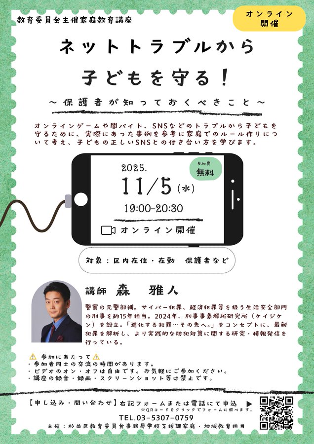 #元警部補 による家庭教育講座 ネットトラブルから 子どもを守るには オンラインゲームや #闇バイト SNSトラブルなど、実際の事例からスマホとの付き合い方を考えます! オンライン開催です! 11/5(水)19:00~20:30 小中学生の保護者ほか40名(抽選) 10/31 https://city.suginami.tokyo.jp/s111/event/22262.html…
