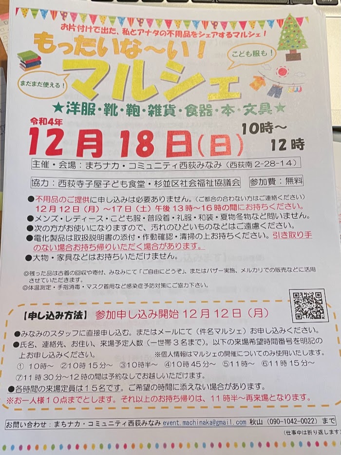 12月18日(日)10時~12時開催予定。不用品のご提供・当日のお持ち帰り参加申し込みは、12日(月)~17日(土)13時~16時受付となります。みなみへ直接またはevent.machinaka@gmail.comへ。不用品のご提供・当日の参加は、基本的に西荻みなみのご近所さんに限ります。