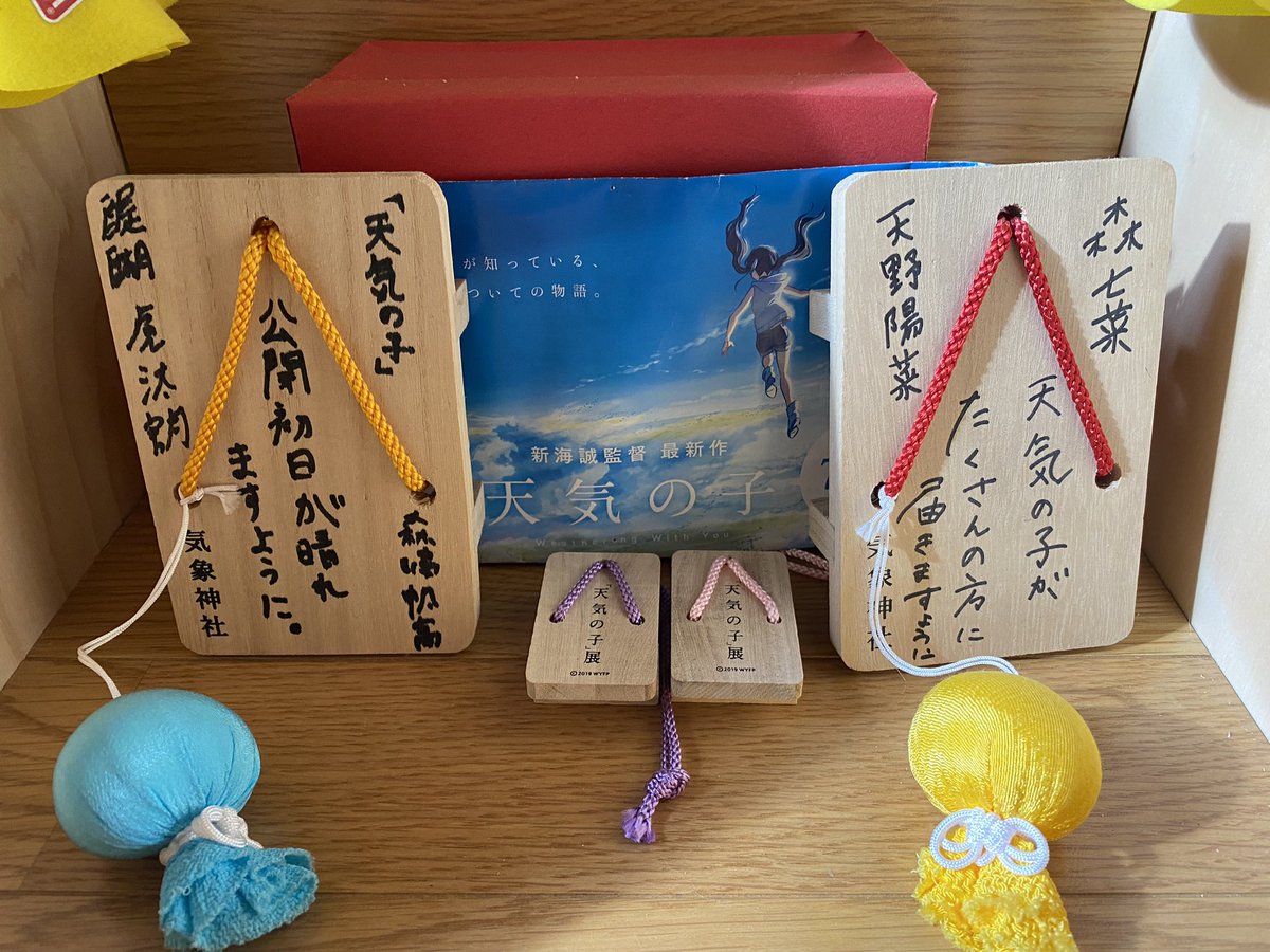 下駄絵馬は気象神社の授与品で最も歴史があります。昔は明日の天気を占う時に、下駄やサンダルを投げていました。境内には参拝者の祈願が込められた下駄絵馬でいっぱいです。2019年には映画「天気の子」で登場しました。
