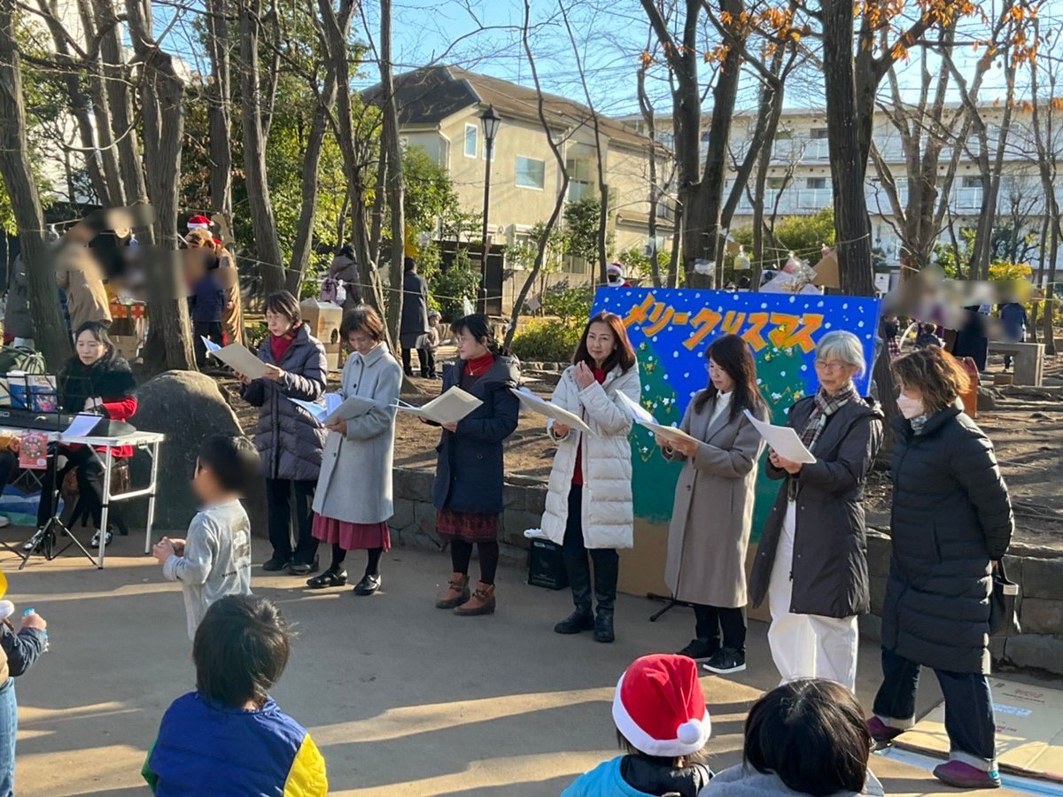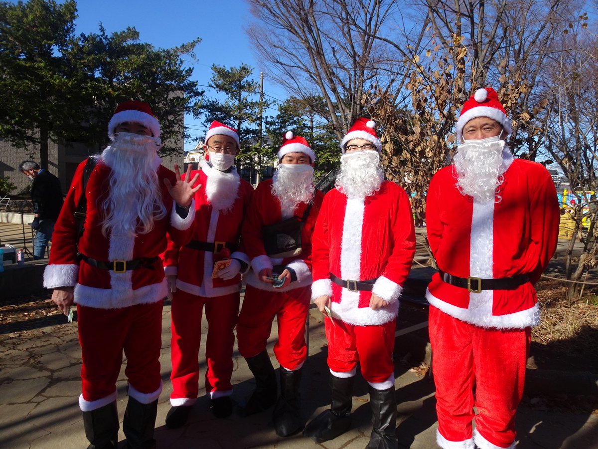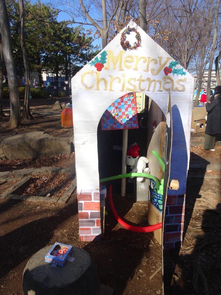 12月25日(日)大宮前公園で開いたクリスマスイベント。たくさんのサンタクロースとトナカイが登場! 今回も東京女子大松尾ゼミの学生さんが『ダンボールハウス』作りなど参加してくれました! 見守りは近隣町会の皆さん。荻中PTAコーラスの皆さんの歌声も響きました✨