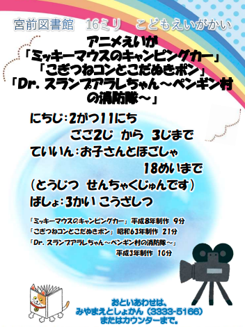 2月11日(土)「16ミリこどもえいがかい」を行います! 「ミッキーマウスのキャンピングカー」、「Dr.スランプアラレちゃん」などの懐かしい作品を16ミリで上映します。(当日先着順)みなさまのご参加をお待ちしております♪