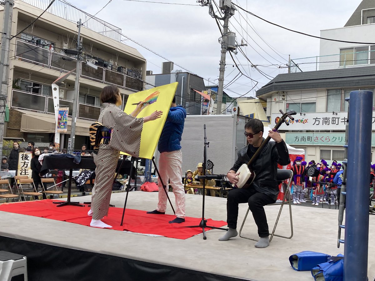 盲目の演奏者・服部こうじさんの三味線に合わせ、書道家・松隈恵理子さんの書道アートの素晴らしいパフォーマンスでした(矢口が裏で支えております)。