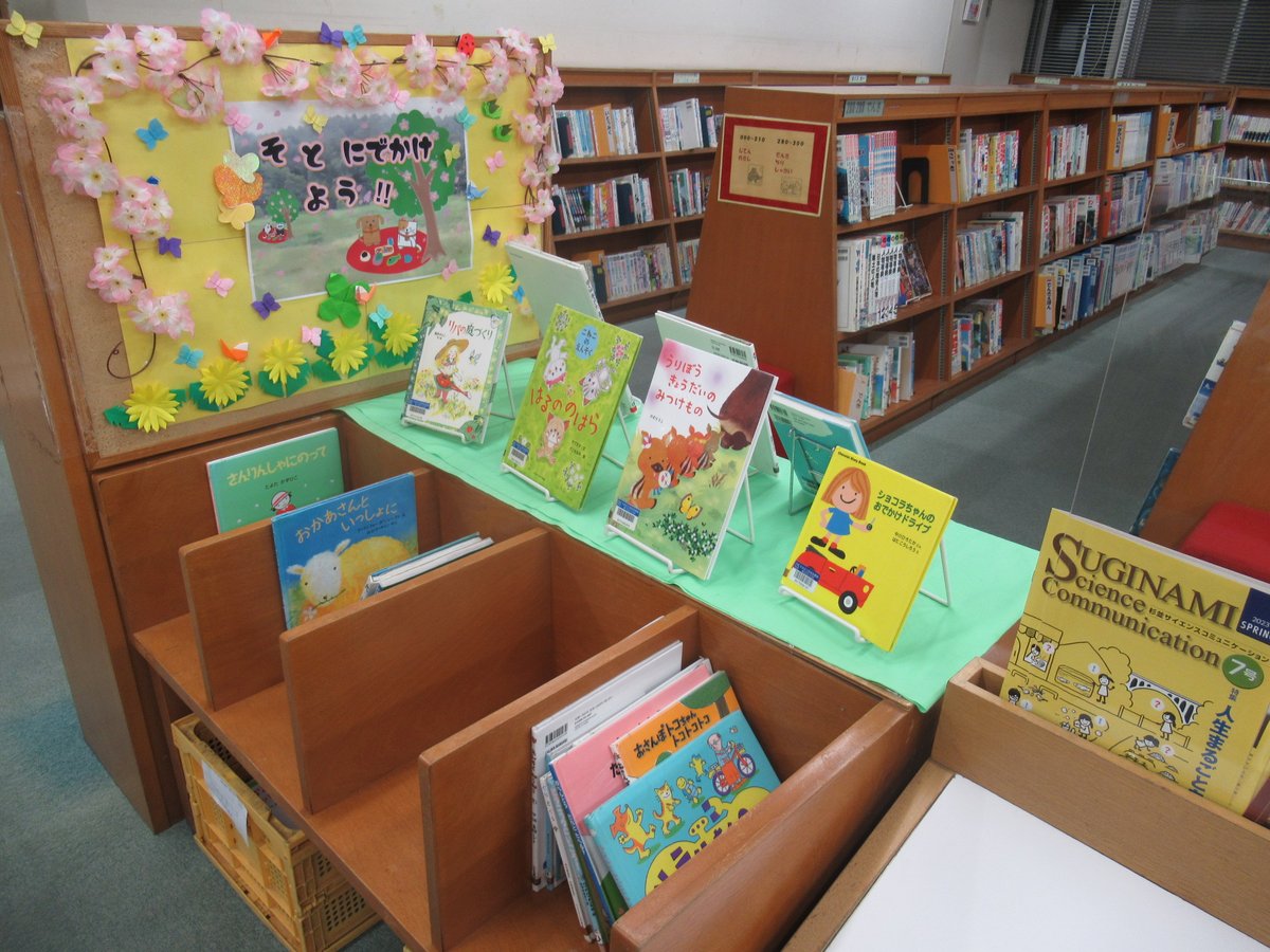 宮前図書館1階児童コーナーの展示は「そとにでかけよう」です。暖かくなり外にお出かけしたくなるような本を集めてみました。ご来館の際はぜひご覧ください。