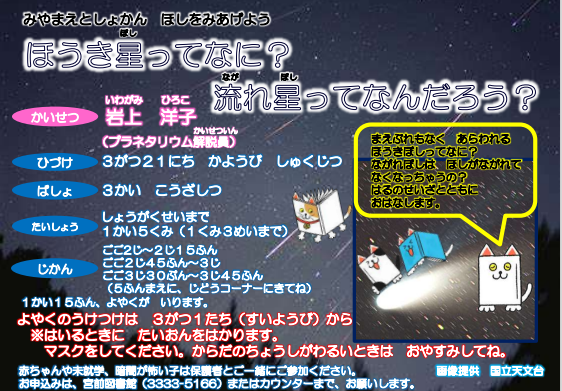 3月21日(火・祝)の「ほうき星ってなに?流れ星って何だろう?」はまだ空きがございます。プラネタリウムを講座室の天井に投影して、綺麗な映像を見ながら解説員のお話を伺います。ぜひお子様とご参加ください。
