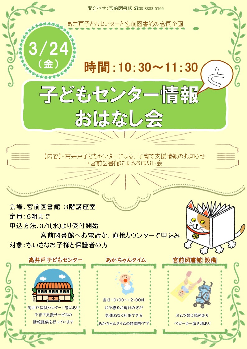 本日10時30分から「子どもセンター情報とおはなし会」を開催します。まだ空きがございますので、ぜひお子様とご一緒にご参加ください。おはなし会のほか、高井戸子どもセンターから育児についてお役立ち情報の提供がございます。
