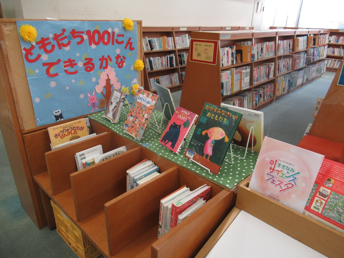 現在1階児童コーナーでは「ともだち100人できるかな?」をテーマに展示しています。春は別れと出会いの季節、友達に関連する本を集めました。ぜひお子様とご一緒にご覧ください。
