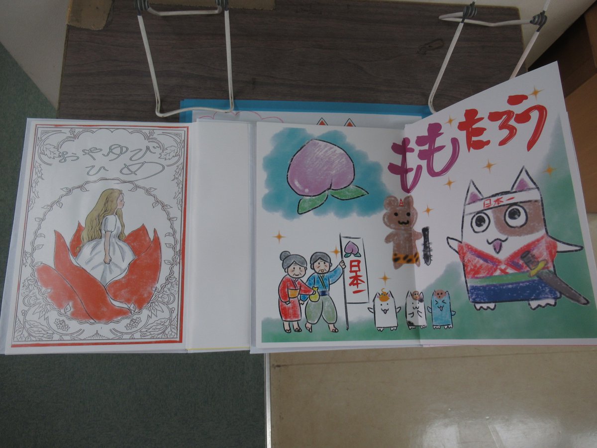 みなさまに描いていただいた手作り絵本が完成しました!児童コーナー入り口に絵本を展示しています。作品の絵を児童コーナーの壁に飾っておりますので、そちらもご覧ください。みなさまのご来館をお待ちしております。