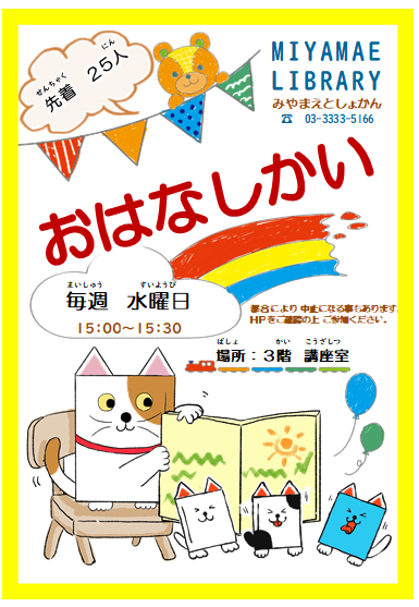 【図書館】5/3(水)は祝日のため夕方5時までの開館です。次の休館日は5/8(月)です。本日午後3時より、おはなし会を行います。参加されるお子様は10分前になりましたら、直接3階講座室までお越しください。ご参加をお待ちしております♪