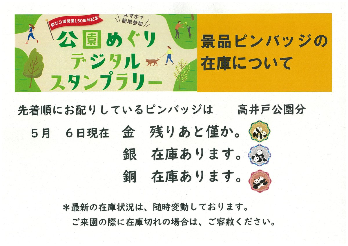 ご好評につき、公園巡りデジタルスタンプラリーの景品のうち、金のバッジが残りあと僅かとなりました。