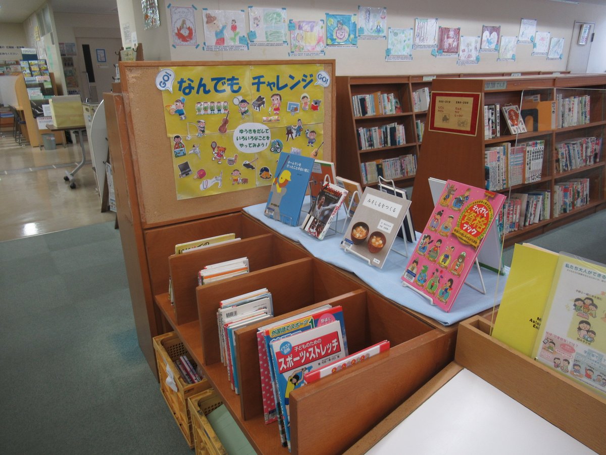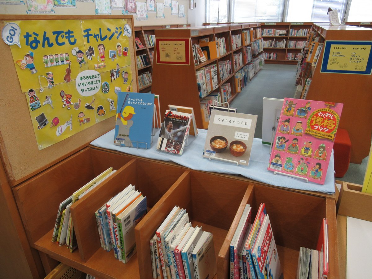【図書館】本日5/15(月)は夜8時までの開館です。 今月の児童展示のテーマは「なんでも チャレンジ!!」です。 ”ゆうきをだして、いろんなことをやってみよー!!” という気持ちになるような本をたくさん集めました。ぜひご覧ください♪